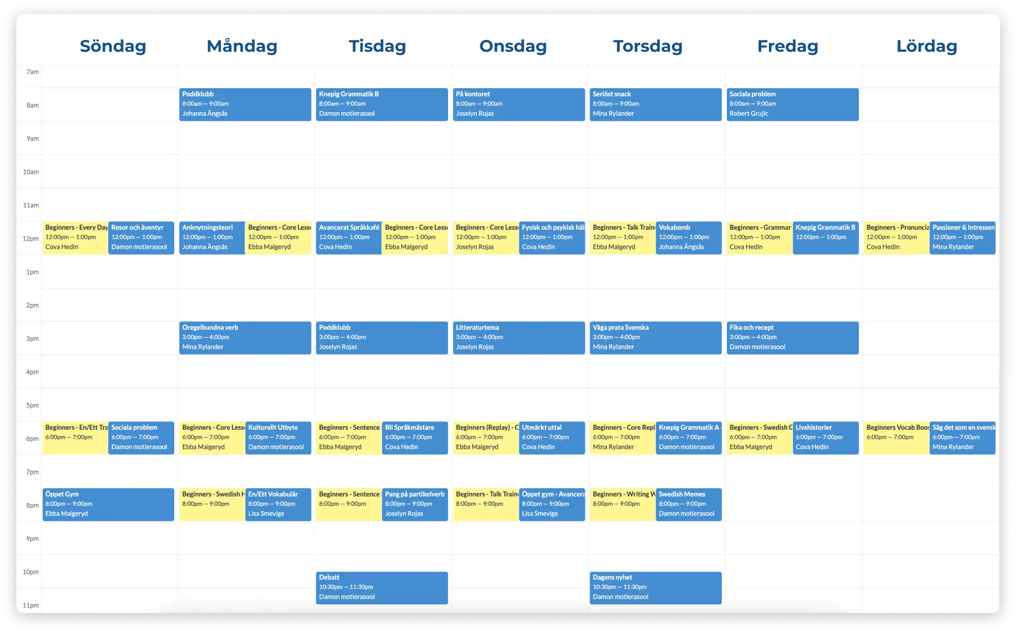 Language Lock In group classes typically start at 8:00, 12:00, 15:00, 18:00, 20:00 or 22:30 Swedish time. Beginners classes take place at 12:00, 18:00, and 20:00 Swedish time.